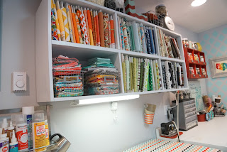 Here is a better shot of my ironing board. I used this adorable fabric by adornit to cover it. Below is all of my bins for fabric scraps. I organize them by color.