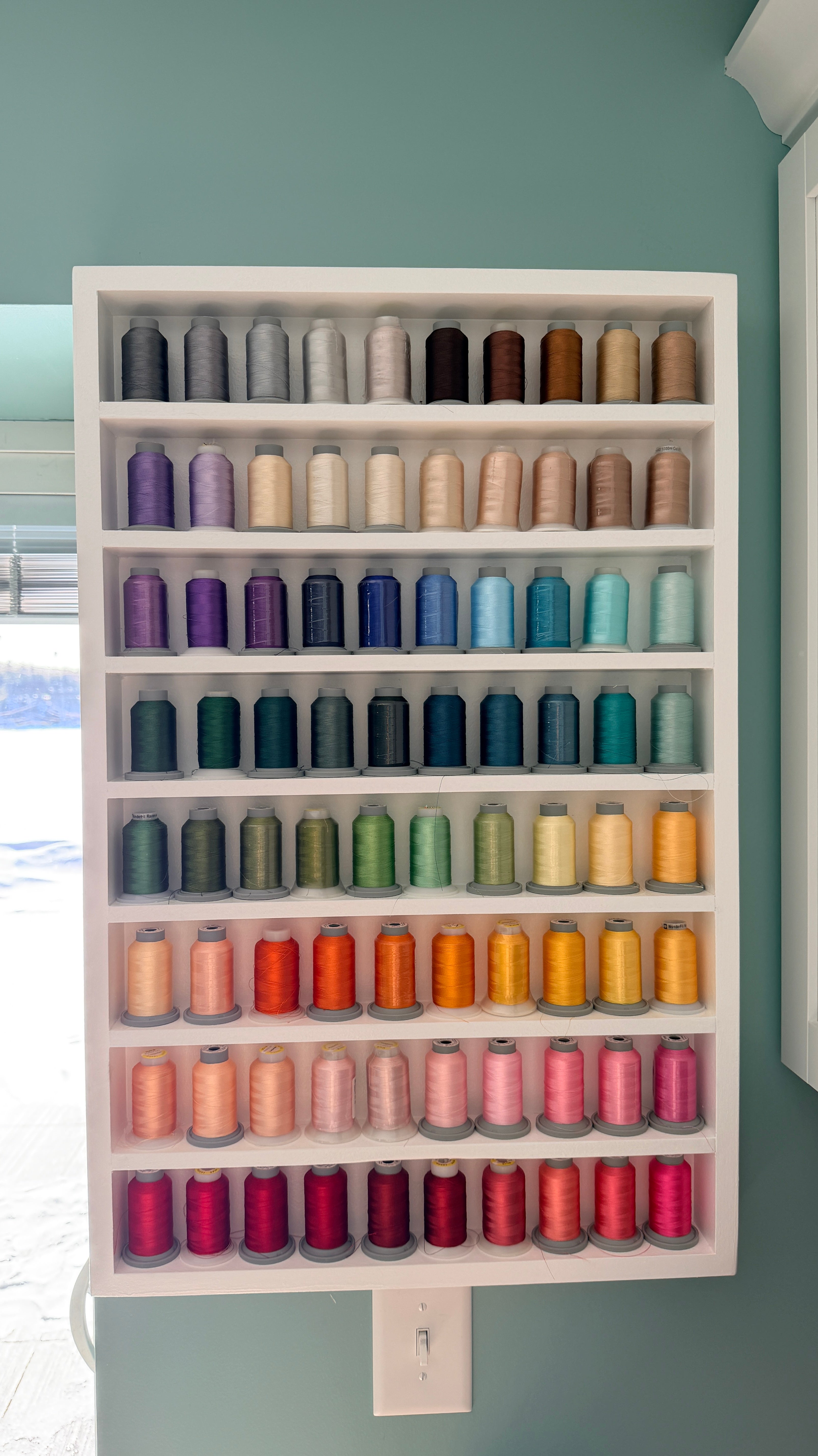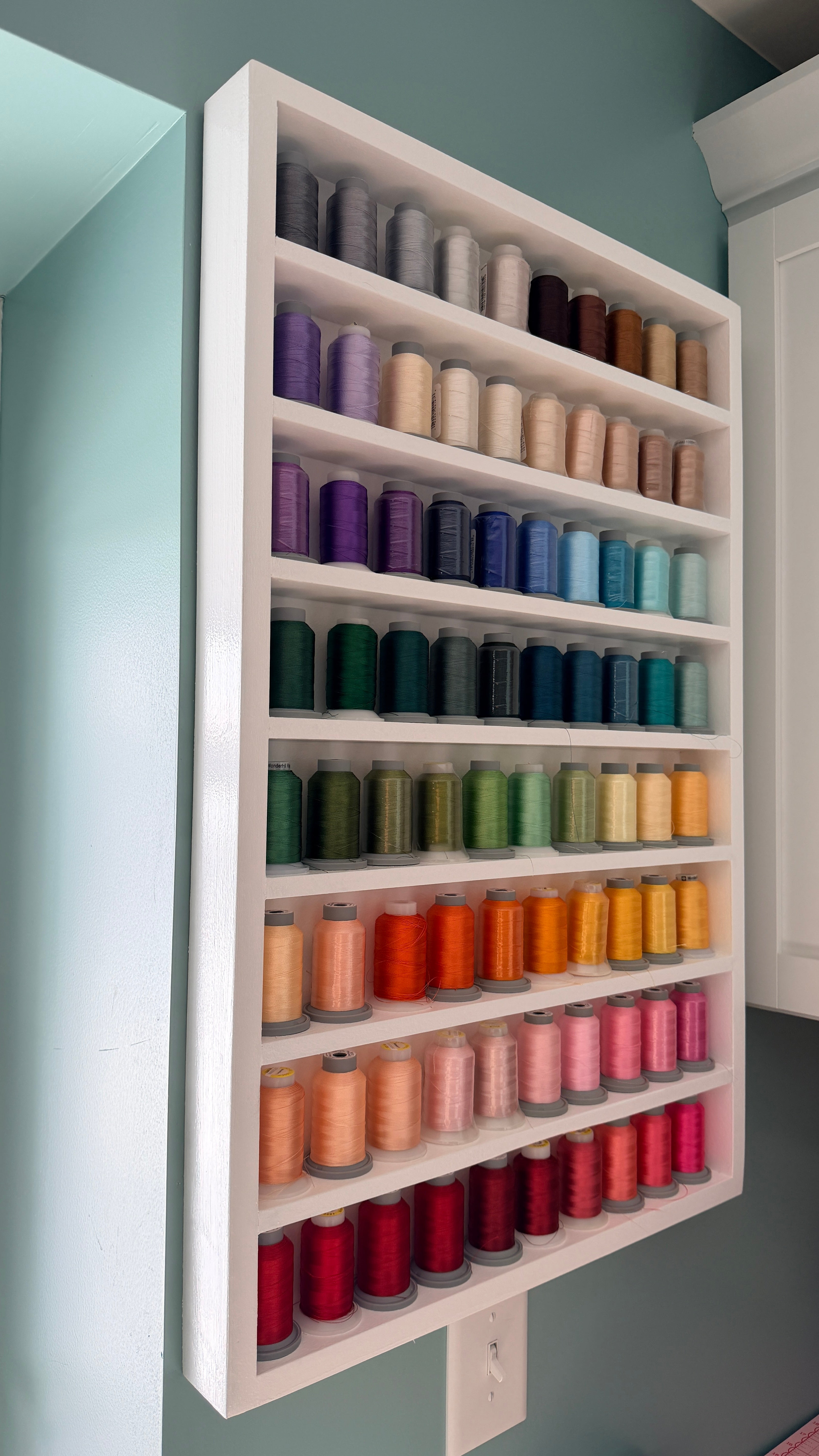 Keep your thread collection beautifully organized and always within reach with this 80 spool thread shelf. Designed to hold up to 80 standard size spools, this wall mounted rack turns your thread into functional storage while doubling as visual inspiration for your sewing or craft space.